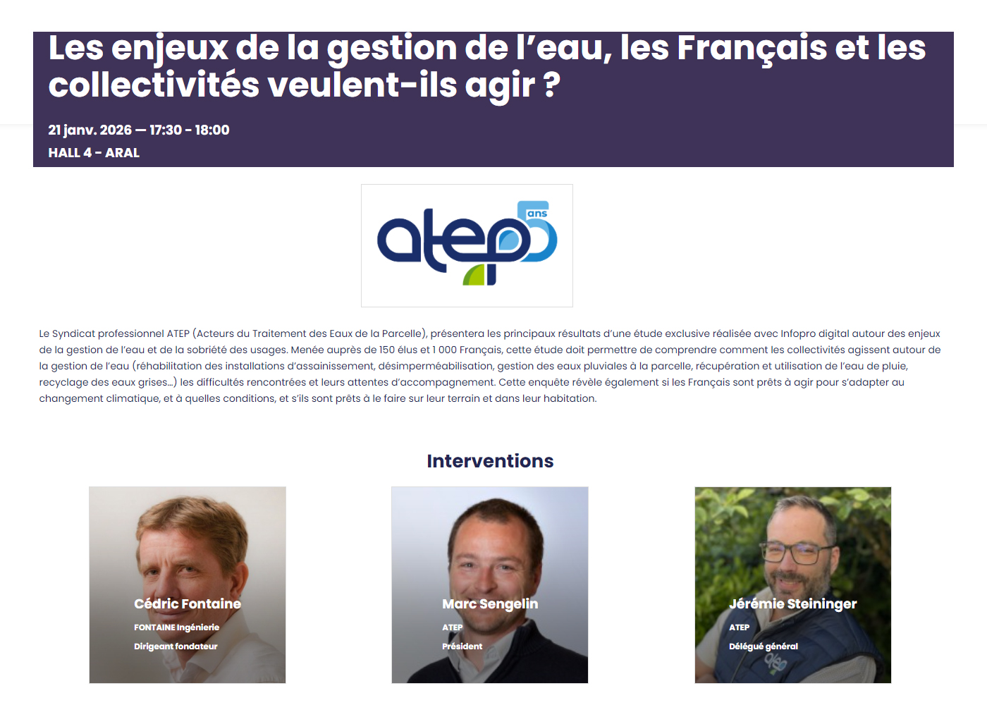 À l’occasion du Carrefour des Gestions Locales de l’Eau (CGLE), le Syndicat professionnel ATEP (Acteurs du Traitement des Eaux de la Parcelle), révèlera les résultats de l’étude menée auprès d’un échantillon de 1 000 personnes représentatif de la population française sur les enjeux de la gestion de l’eau et de la sobriété des usages.